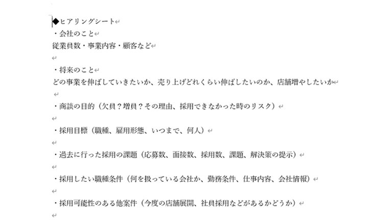 もちろん、その場の思いつきで質問していくわけではありません。「採用事例を参考にするとこういう原稿が良さそうだから、具体的なエピソードを聞いてみよう」「提案をするには、この情報が足りないから聞いてみよう」というように、商談前準備の段階でヒアリング内容も整理して臨みます。