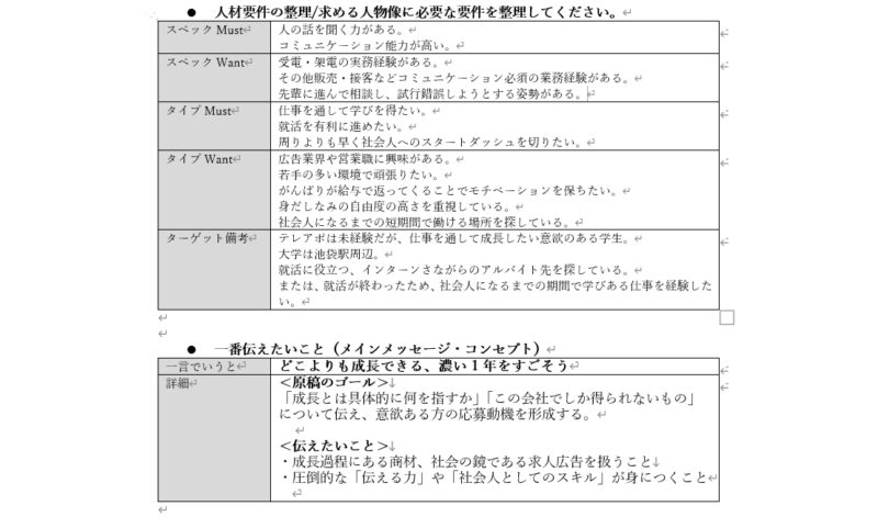 広告制作を発注する際に重要になるのは、「どういう人を採用するために、何を伝える原稿にするのか」という広告の軸です。集めてきた情報をそのまま渡すだけでは広告の方向性がブレてしまう恐れがあるため、お客様と打ち合わせした内容を踏まえながら、広告の全体像をわかりやすくまとめていきます。