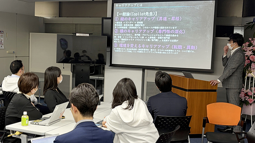 さらに、進捗共有会では毎回、次長・部長を中心に管理職が講師となる特別プログラムも実施しています。現在管理職に就いている先輩社員が、どのような目標を掲げ、どのような努力を重ねてきたのかを知ることで、自身のキャリアに活かしてほしいという想いで企画しました。